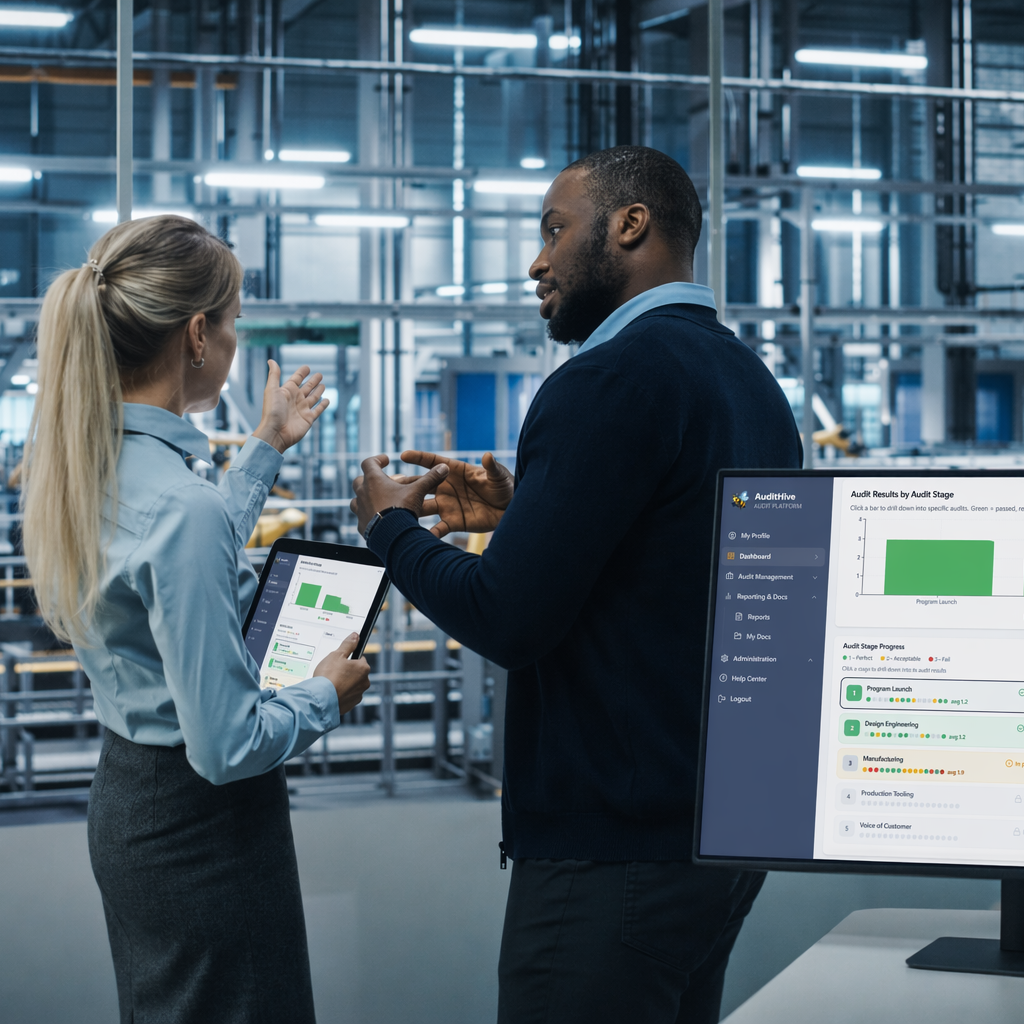 Move beyond manual, disconnected processes and gain a structured, configurable environment that supports comprehensive quality management audits. AuditHive enables consistent evaluation of processes and products against ISO standards, automotive audit phases, and other regulatory frameworks—aligned to your existing methodology.